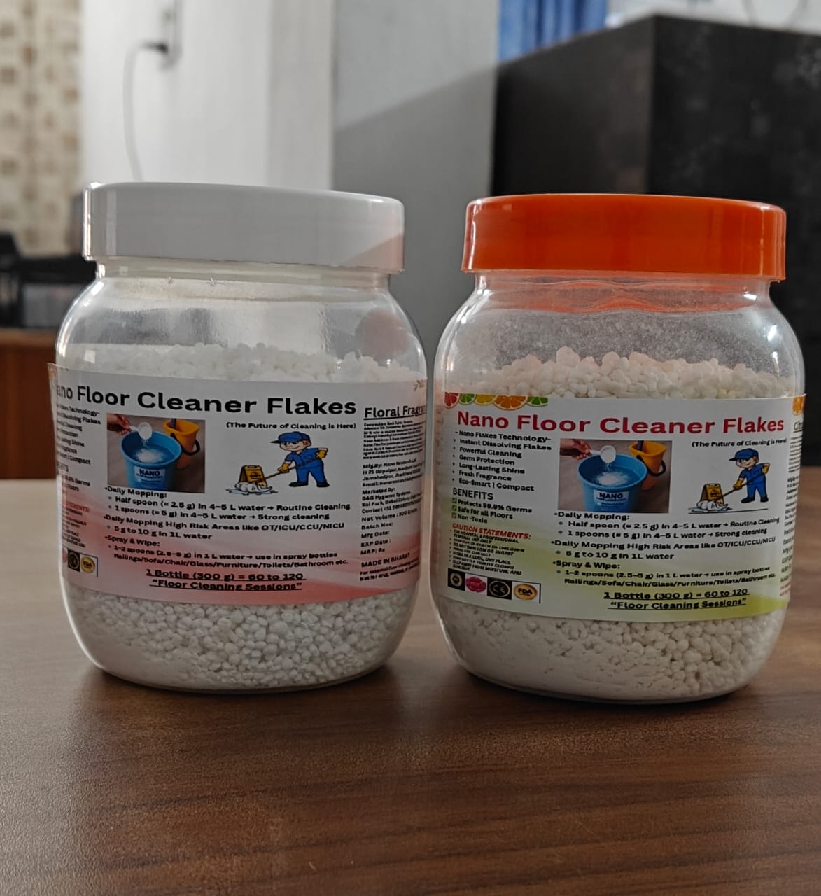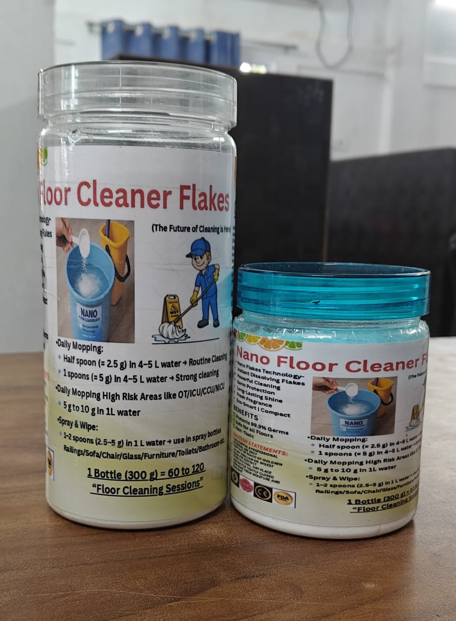 Nano Floor Cleaner Flakes: Instant dissolving, multipurpose, and disinfectant flakes.Nano Phenyl Floor Cleaner Flakes: Familiar phenyl cleaning experience ,Improved hygiene with controlled fragrance ,Flakes format — no leakage, no wastage