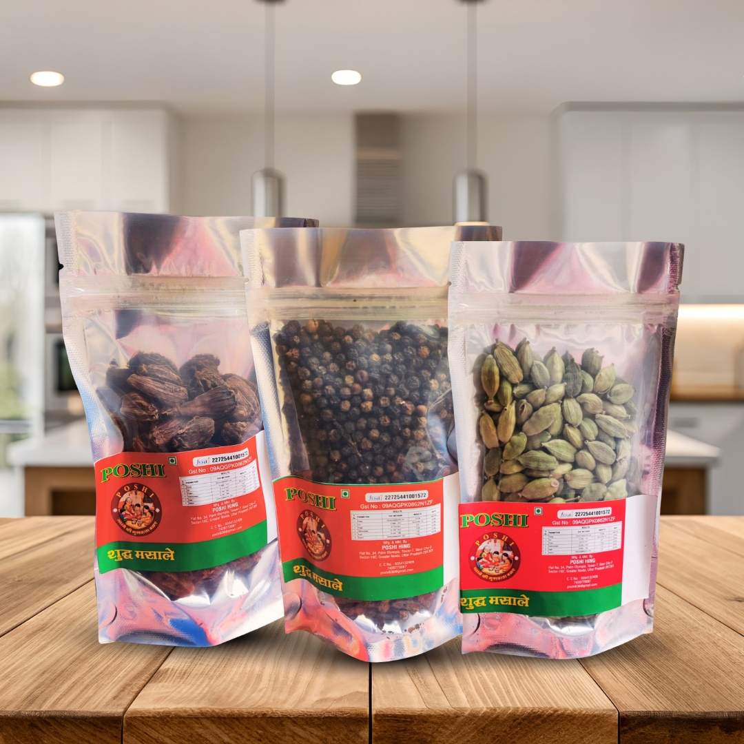 Poshi offers a diverse and carefully curated product range designed to meet daily cooking and commercial culinary needs. Our portfolio includes Garam Masala, Green Cardamom, Black Cardamom, Cloves, Cinnamon, Bay Leaf, Methi Dana, Carom Seed (Ajwain), Asafoetida (Hing), and Coriander Products, along with several other whole and blended spices. All products are sourced from trusted origins and processed to retain their natural oils, flavor strength, and nutritional value. Poshi spices are ideal for households, hotels, restaurants, catering services, and retail markets, making them high-demand products with strong repeat consumption.