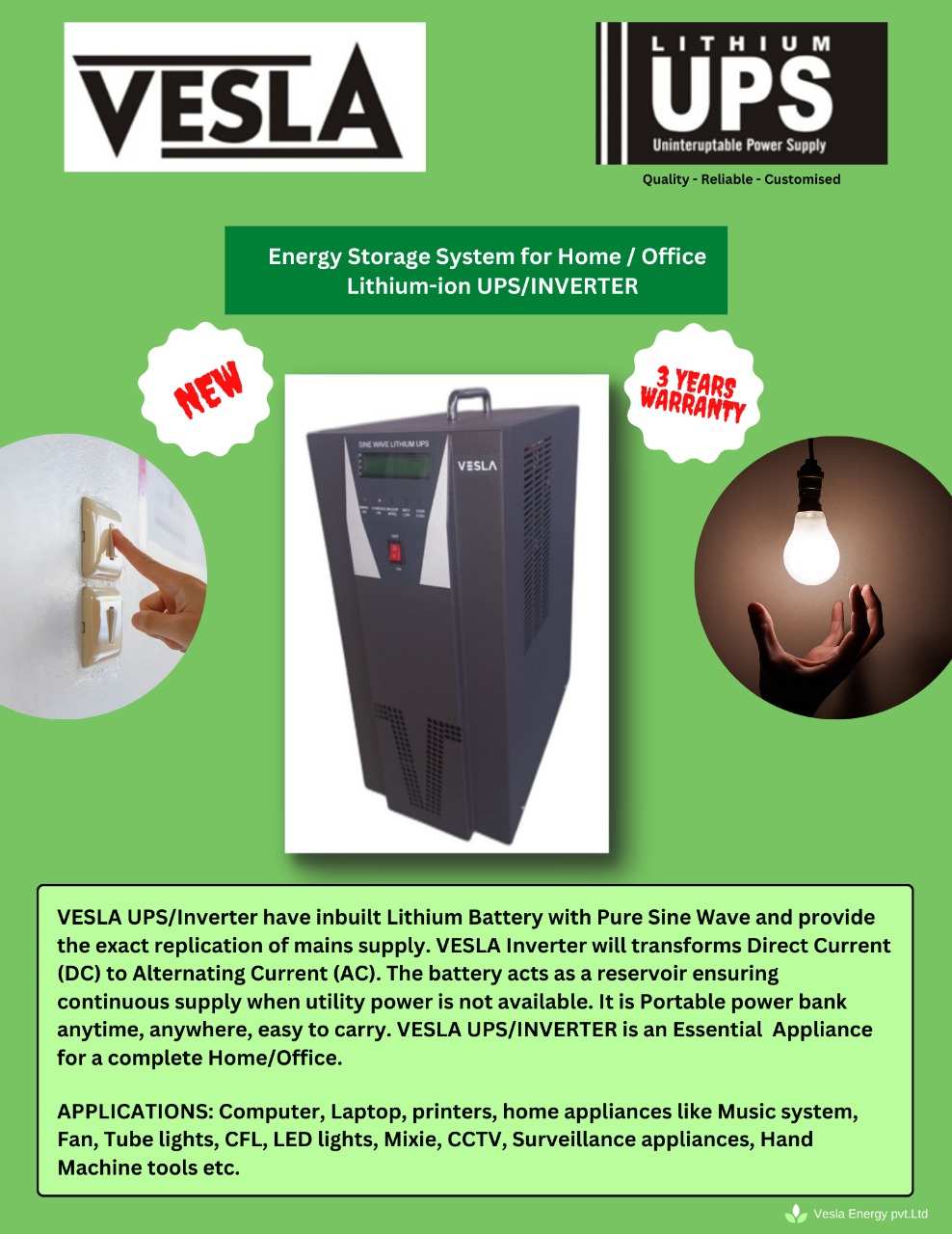 We Vesla Energy Private Limited manufacture and supply an extensive range of premium quality lithium-ion battery cells, rechargeable lithium batteries, Hunan battery cells, vesla sine wave UPS, two-wheeler prismatic battery cells, electric vehicle batteries, electric bicycle batteries, portable lithium-ion system cells, and related products. The offered products, which are sold under the "Vesla" brand, are long-lasting, quite sturdy, and very well-liked because they outperform competing technologies in several key ways, including being significantly lighter than other types of rechargeable batteries, having a higher energy density, having a reactive element, etc. Our goods are built with recognized-grade raw materials and are planned by international quality standards to provide durability, breakage resistance, and longer working life. Furthermore, they are made with cutting-edge machinery. All of these premium products are available to our consumers from us at reasonable costs.